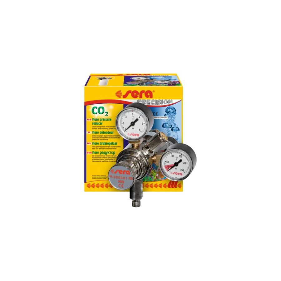 sera flore CO2 pressure reducer ze zintegrowanym precyzyjnym zaworem regulacji produkowany jest w Niemczech, jest niezawodny i bezpiecznie redukuje ciśnienie gazu. Może być podłączany do wszystkich typowych butli z CO2 z zaworem zewnętrznym.